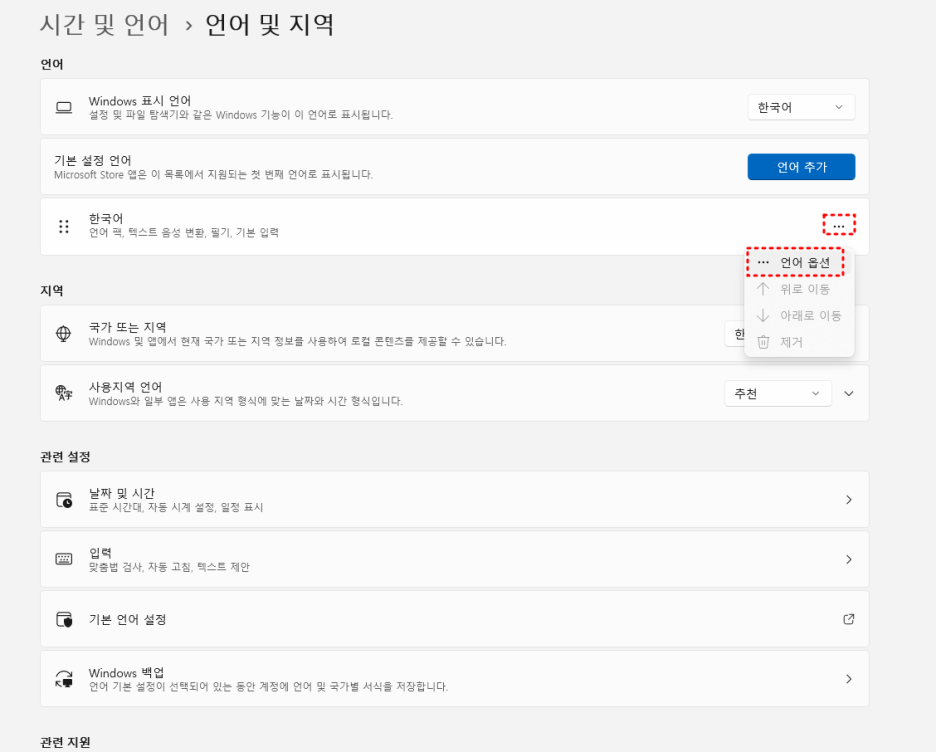 윈도우11의 하단 검색창에 IME라고 치고 나타나는 언어 및 키보드 옵션 편집을 클릭한다