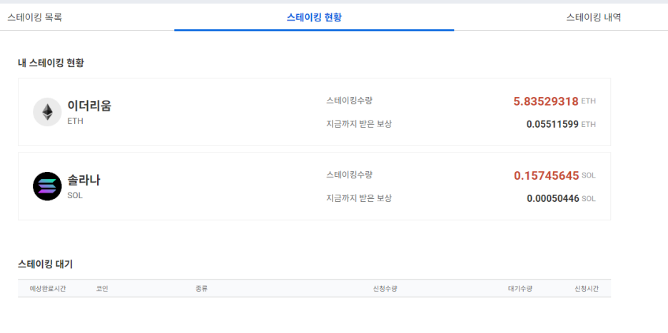 신청하고 나서 보니 이게 바로 스테이킹이 되는게 아니라 대기하다가 이더리움을 모아 블록체인에 올리는 방식으로 몇일 걸린다. 하는 김에 결제에 쓴 솔라나도 스테이킹 되길래 같이 넣어두었다.