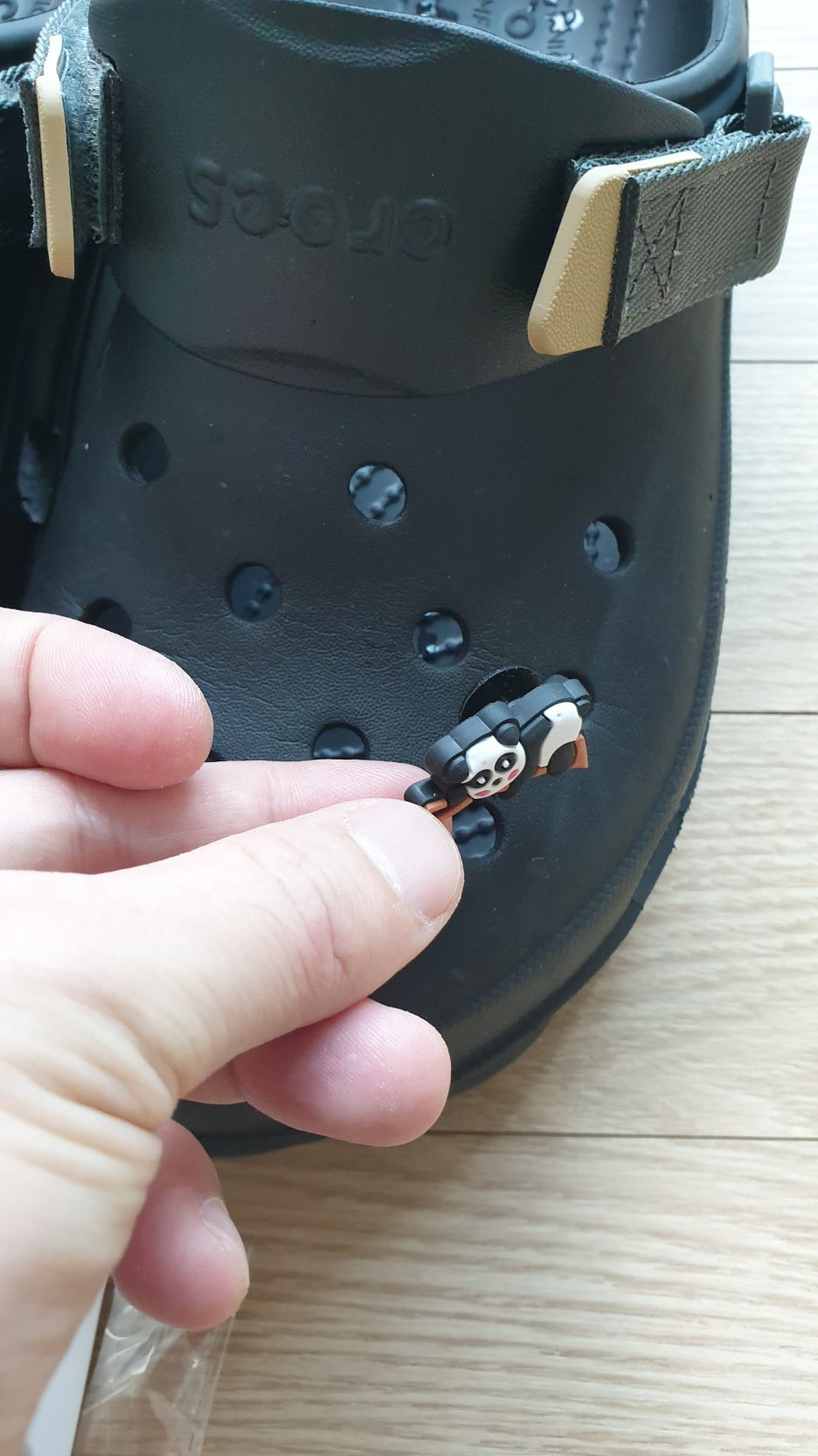 끼우고 나니 귀엽다 ㅋㅋ 크록스는 여름철 물놀이와 수상레저를 즐기기 위해 슬리퍼보단 편하고 좋게 만들되 통풍과 물빠짐을 위해서 구멍을 냈는데, 자녀를 가진 부모가 이를 꾸며주기 위해 만든 악세사리가 시초라고 한다.