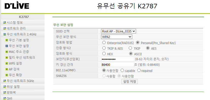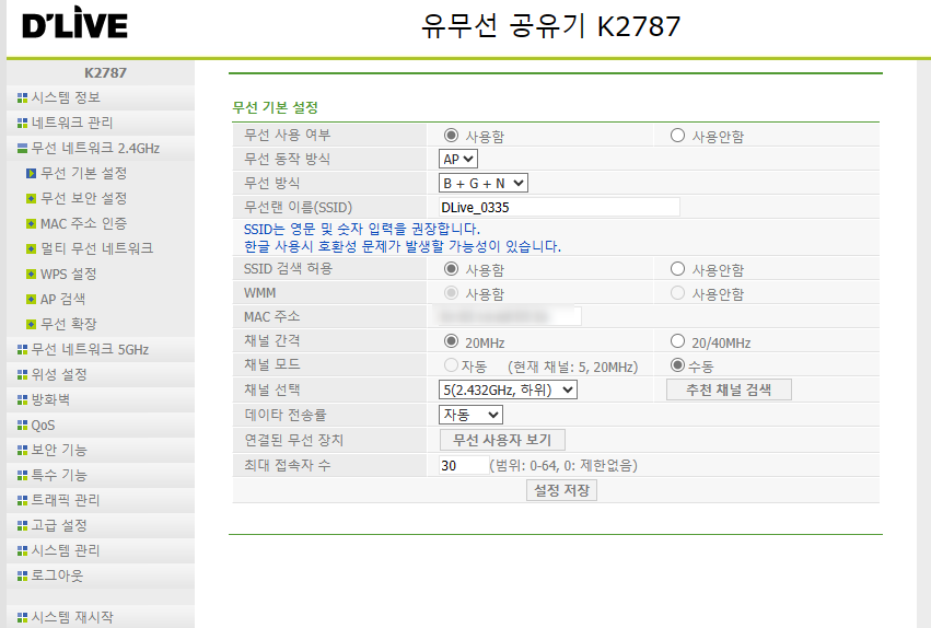 무선 네트워크를 누르면 일단 무선랜 이름을 변경 할 수 있다. 유용한게 가끔 누가 와서 와이파이 뭐냐고 물어보면 생각이 안나 난감할 때가 있으니 바꾸어 둬서 알려주면 간단하게 해결된다.. 특히 세대별로 비슷하게 여러개가 떠있을 때가 많기 때문에..