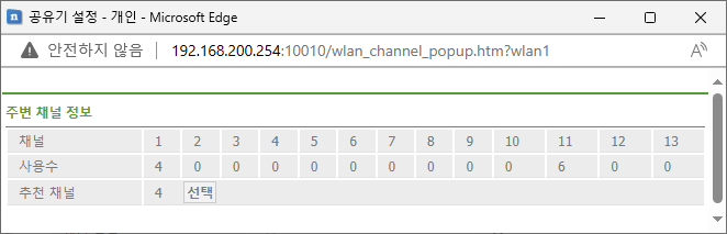 그 위에 "추천 채널 검색" 이라는 버튼을 누르면 채널을 선택 할 수 있다. 보통 1번과 11번이 많은데 이를 우회해 아무도 사용하지 않는 채널을 사용하는 것이 신호가 겹칠일 도 없고 좋으니 바꾸어 주자
