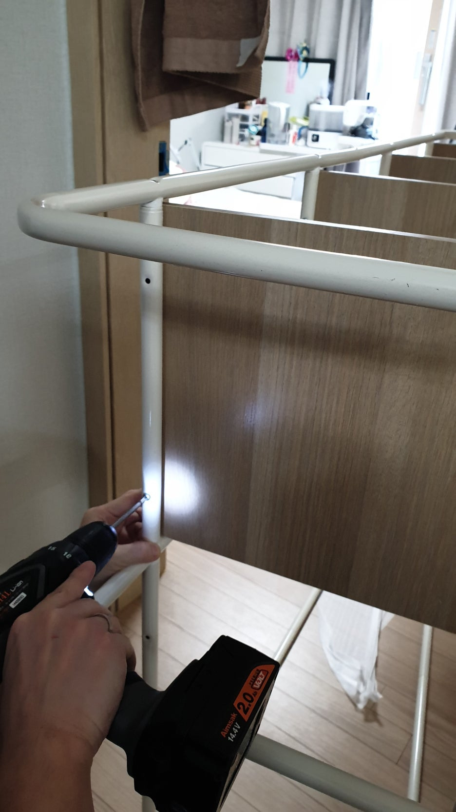 프레임 조립엔 별로 문제가 없었는데 선반에 피스 나사로 박는 작업은 전동드라이버를 가져오지 않았다면 조립하기가 여간 힘든게 아니었을 것이라고 생각이 들었다. 사실 선반에 미리 홀을 뚫기도 애매할 거고.. 위치 홈만 새겨져 있었다