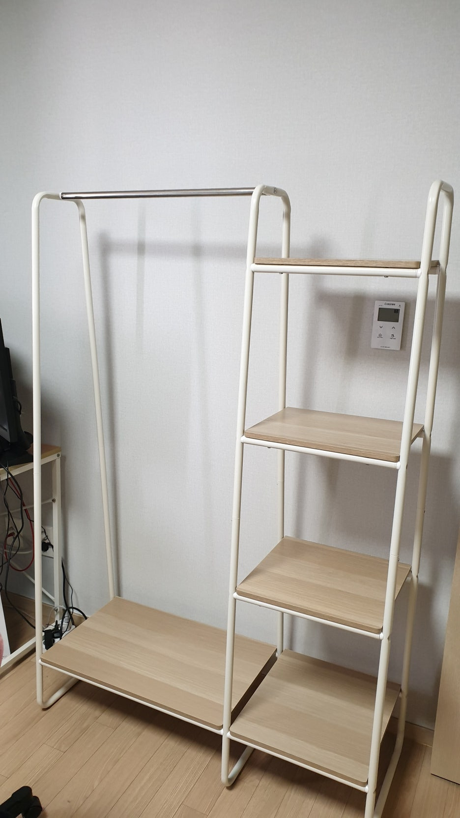 조립하고나서 옷을 정리하니 매우 예쁘고 괜찮았다. 그런데 선반을 다는게 그냥 드라이버만 가지고 하기엔 좀 힘들어보여서 솔직히 이걸 전동드라이버가 없는 사람이 조립 할 수 있나 싶은 생각이 들긴 했다. 그래도 확실히 선반이 있으니 가방이나 기타 짐들을 행거에 같이 올려놓을 수 있어 정리하기에 용이했고 잘 샀다는 생각이 들어 매우 만족했다!! 스탠드행거를 고민하고 있다면 선반형도 좋으니 추천!!