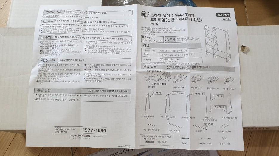 꺼내면 선반아래 봉, 나사, 메뉴얼이 잘 포장되어 있었다.
