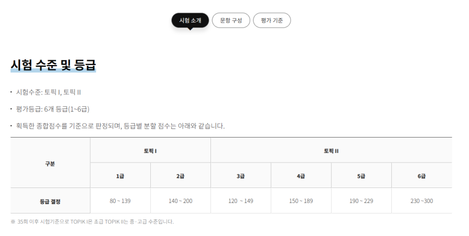 토픽 시험은 1,2로 나뉘어지고 응시한 점수에 따라 급수가 나뉘어지는데 토픽1은1~2 토픽2는 3~6까지 존재하고 점수 범위로 급수가 결정된다. 6급이 가장 높은 점수를 취득한 경우이다.